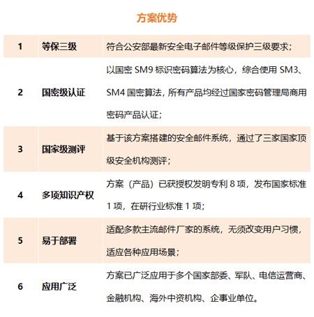 方案以SM9标识密码算法为核心,综合使用SM3、SM4国密算法,遵循国家电子邮件相关邮件安全标准,符合公安部等保三级要求,对电子邮件增强身份认证、对传输和存储进行加密,实现电子邮件系统全方位安全保护。