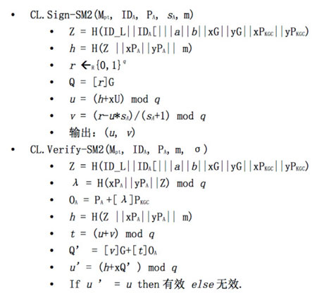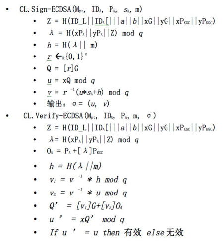需要指出的是在这个密钥前缀化过程中,我们对ECDSA、SM2的签名、验签过程是没有任何改变的,因此无需对现有的ECDSA、SM2算法的软、硬件实现进行任何修改。下面分别描述基于λ为密钥前缀基于ECDSA的无证书签名算法,以及以Z||PA为密钥前缀基于SM2的无证书签名算法。