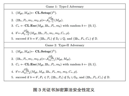 基于以上函数定义我们可以进一步定义密钥生成算法、无证书签名算法、加密算法等的安全模型。这些安全模型的定义采用AP-CL-PKC的定义方法对应两类不同的攻击人:类型-I攻击人是普通的攻击人,他试图冒充他人获得私钥、伪造签名或者获取密文相关信息。类型-II攻击人是好奇的KGC。这类KGC试图在不留痕迹的情况下冒充某个用户获得私钥、伪造签名或者获取密文相关信息。简单描述如下: