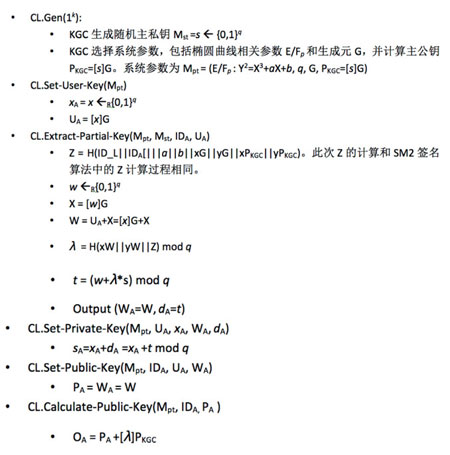 Al-Riyami和Paterson在2001年提出无证书的密码体制后引起广泛的关注。学术界进行了大量的安全模型理论研究并构造了一系列包括无证书加密算法、签名算法和密钥交换协议等安全机制。遗憾的是,由于Al-Riyami和Paterson对CL-PKC中密钥生成算法的定义方法导致这类模型无法覆盖隐式证书系统,生成的密钥对难以结合标准的如ECC密码算法使用。一些基于标准算法的无证书签名算法构造都被证明不能满足 Al-Riyami和Paterson的安全模型。下面简单描述AP-CL-PKC中的密钥生成方法(CL-KGA),并分析其局限性。AP-CL-PKC由以下五个函数构成: