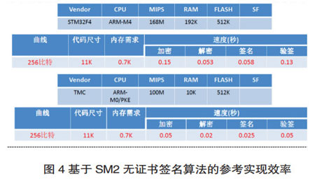 图4是基于SM2的无证书签名在ARM4芯片上的参考实现以及在一高安全芯片上实现的性能报告。ARM-M4上的实现经过汇编优化后整体性能可提高10倍以上,能满足多场景的需求。在高安全芯片上基于芯片内SM2算法和点乘计算硬件,可以高效实现无证书算法。