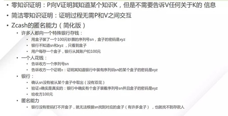 在Zcash上如何实现隐私保护?一个简化版Zcash匿名能力的场景化来描述。许多人都向一个特殊银行存钱,每个人用盒子装了一个100元钞票的序列号sn,盒子的密码是xyz,银行不知道sn和xyz ,只看到盒子。用户每存一个盒子,银行从其账户扣100元,个人消费的时候只需要告诉收款方一个序列号sn和一个证明p,证明其知道银行中装有序列码sn的某个盒子的密码是xyz;兑付时,收款方提供序列号sn和证明p。银行方首先需要确认sn没有被从某个盒子中取出(没有双花),然后验证p确实是真实的,即银行中确实有个盒子装着序列号sn并且盒子的密码是xyz,证明成功后给收款方100元。那如何做保护隐私呢?匿名能力表现在:证明过程中,银行没有密码,打不开盒子,就无法根据sn找到对应的盒子(有许多人存了盒子) ,也就找不到sn对应的具体存款人,就能保护消费者的隐私。这个过程用了重要的技术:零知识证明,就是我们能证明一件事情,同时不告诉对方这个秘密是什么。