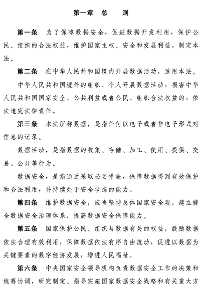 草案共分七章,依次为总则、数据安全与发展、数据安全制度、数据安全保护义务、政务数据安全与开放、法律责任和附则。